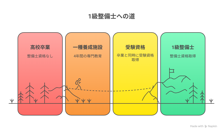 最短で1級整備士を目指す場合、高校卒業後などに一種養成施設(4年制)に入学することが最も確実です。